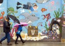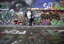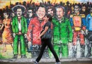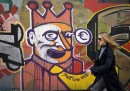 Foto di persone di passaggio davanti a muri dipinti, per arte, protesta o per celebrare qualcuno