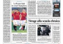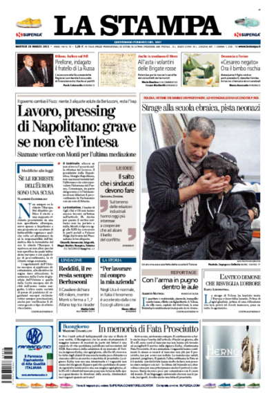 L’incontro al Quirinale fra il Presidente della Repubblica, il Presidente del consiglio Monti e il ministro Fornero sulla riforma del lavoro, con le sollecitazioni di Napolitano a trovare un’intesa con le parti sociali, è la notizia di apertura su molti giornali di oggi. L’altra notizia che compare su tutte le prime pagine e con la quale aprono il Corriere della Sera, il Manifesto e l’Unità, è la strage alla scuola ebraica di Tolosa, dove un uomo ha sparato uccidendo tre bambini e un insegnante. Il Giornale si occupa invece delle dichiarazioni dei redditi dei politici, Libero delle tasse sulla casa (l'”esproprio di Monti”), e il Mattino dell’operazione contro la camorra che ha portato all’arresto, fra gli altri, di sedici giudici tributari. I quotidiani sportivi titolano sulla semifinale di coppa Italia di stasera fra Milan e Juventus.