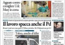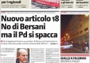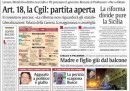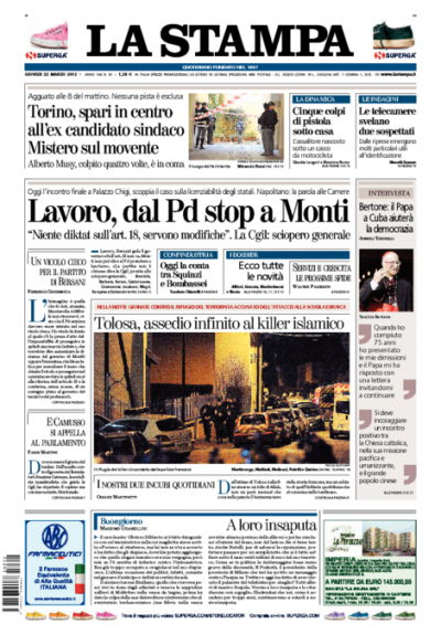 La riforma del lavoro è ancora in primo piano sui giornali di oggi: il Corriere della Sera, la Stampa e la Repubblica si occupano delle critiche del PD e della CGIL, che annuncia lo sciopero generale se le modifiche all’articolo 18 verranno approvate così come sono state annunciate dal governo, il Messaggero e Libero aprono invece con l’esclusione degli impiegati statali dalle nuove norme sui licenziamenti. Le altre notizie presenti su quasi tutte le prime pagine di oggi sono l’assedio al presunto assassino di Tolosa, il ferimento a Torino del consigliere comunale dell’UDC Alberto Musy, la morte di Tonino Guerra e una nuova perizia sul delitto di via Poma che scagionerebbe l’ex fidanzato di Simonetta Cesaroni, condannato in primo grado a 24 anni. I quotidiani sportivi aprono con la vittoria sul Siena del Napoli, che raggiunge così la Juventus in finale di coppa Italia.
