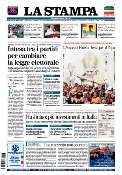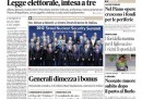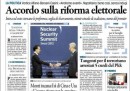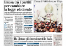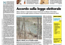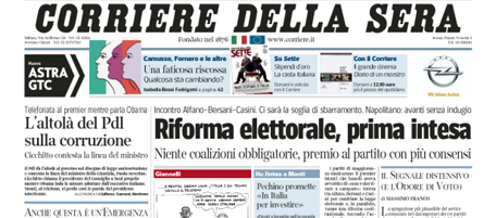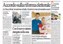 Oggi i quotidiani aprono quasi tutti con l’incontro fra i segretari di PD, PDL e UDC, che hanno raggiunto un accordo sulla riforma della legge elettorale, che non preveda più l’obbligo per i partiti di indicare la coalizione con cui si intende governare, e sulla riduzione del numero dei parlamentari. I temi legati al lavoro sono in prima pagina sul Manifesto, con nuove regole sul diritto di sciopero approvate dalla Commissione Europea e la manifestazione a Roma degli operai Alcoa, e sull’Unità, con la condanna della FIAT per condotta antisindacale alla Magneti Marelli, mentre Libero apre con l’interrogatorio dell’ex tesoriere della Margherita Lusi, che avrebbe coinvolto i vertici del partito. I giornali sportivi titolano sulla partita di stasera in Champions League fra Milan e Barcellona, puntando sul confronto fra Ibrahimovic e Messi.