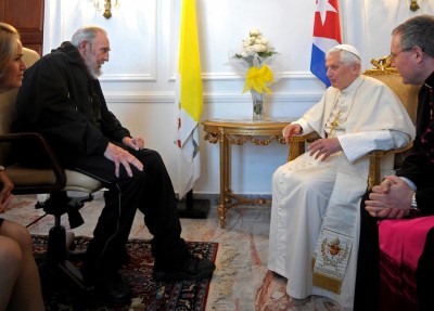 Joseph Ratzinger, 84 anni, papa della Chiesa cattolica, ha incontrato ieri all’Avana l’ex leader rivoluzionario e presidente cubano Fidel Castro, 85 anni. I due hanno parlato per mezz’ora e, secondo un portavoce del Vaticano, Castro ha chiesto al Papa delle responsabilità del suo lavoro e delle novità nella liturgia, facendo battute sul loro essere entrambi ottuagenari. Fidel Castro ha studiato dai gesuiti, da giovane. Prima dell’incontro con Castro, il papa aveva celebrato una messa a Plaza de la Revolución, a l’Avana, nel cuore della Cuba rivoluzionaria: col presidente Raul Castro in prima fila, Ratzinger ha detto che «Cuba e il mondo hanno bisogno di cambiare, ma questo accadrà solo se ciascuno si mette a cercare la verità e sceglie la via dell’amore, verso riconciliazione e fraternità». Il papa ha ringraziato il governo cubano per i passi avanti fatti in questi anni sul fronte della libertà religiosa. Le organizzazioni umanitarie hanno denunciato abusi e arresti illegittimi anche durante la visita di Ratzinger, 150 soltanto mercoledì, secondo Amnesty International. Durante la messa un uomo ha urlato “abbasso il comunismo!”: è stato rapidamente portato via dalle autorità e, dice il Wall Street Journal, non è stato più visto in pubblico. Il Vaticano ha detto che il Papa ha chiesto informazioni sull’uomo al governo cubano e che non ha incontrato gruppi di dissidenti.