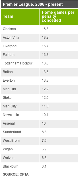 OPTA, ha pubblicato alcuni dati sulla frequenza della concessione dei calci di rigore nella massima serie inglese alla squadra ospite, dal 2006 a oggi. Dalla classifica che ne è venuta fuori, è confermato che pochi rigori vengono fischiati contro le squadre più forti quando giocano in casa: per esempio, il Chelsea, in testa alla classifica, si vede dare un rigore contro solo una volta ogni 18 partite, mentre il Liverpool una ogni 15 circa. Ma è anche vero che vengono fischiati pochi rigori contro anche quando giocano in casa le squadre meno forti: nelle prime posizioni di questa seconda classifica ci sono infatti squadre come l’Aston Villa, il Bolton, il Fulham, l’Everton e lo Stoke City.