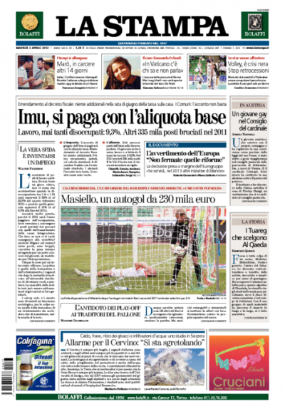 Su molti giornali di oggi l’apertura è dedicata, dopo l’allarme di ieri, alla soluzione della questione dell’IMU, per la quale l’acconto di giugno sarà calcolato sull’aliquota base dell’ICI, in attesa della decisione dei comuni per il saldo a conguaglio di dicembre. Il Corriere della Sera titola invece sulle modifiche alla riforma del lavoro, oggi all’esame di Monti, che viene criticato da Libero per la sua dichiarazione di ieri per cui la crisi sarebbe finita, grazie al lavoro del governo. L’Unità apre con i nuovi dati sulla disoccupazione giovanile, e il Manifesto sulle diverse posizioni nel governo sugli incentivi per le energie rinnovabili. I quotidiani sportivi aprono con l’anticipazione della partita di stasera per la Champions League fra Milan e Barcellona e con l’arresto di Andrea Masiello, che avrebbe dichiarato di aver fatto apposta un autogol nella partita dell’anno scorso con il Lecce, nell’indagine sulle scommesse nel calcio.