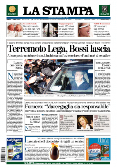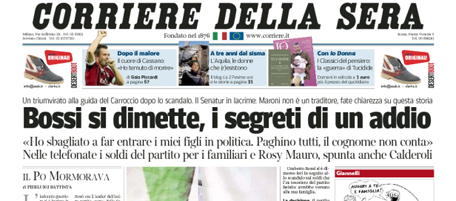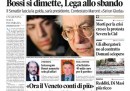 I giornali di oggi aprono tutti con la notizia delle dimissioni di Umberto Bossi da segretario della Lega Nord per l’indagine sull’utilizzo dei finanziamenti al partito per fini personali, indagine che sembrerebbe coinvolgere anche l’ex ministro Calderoli. Le altre notizie che compaiono su molte prime pagine sono relative alla riforma del lavoro, che viene finanziata con nuove tasse sui biglietti aerei e sugli affitti, e sulla quale è nata una nuova polemica fra il Presidente del Consiglio Monti e la Presidente di Confindustria Marcegaglia che ha giudicato “pessimo” il testo del disegno di legge.