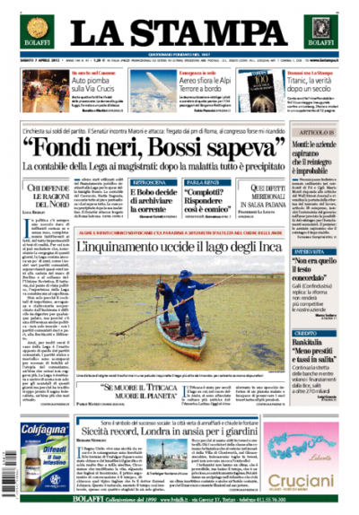 I giornali di oggi aprono tutti con l’inchiesta sui finanziamenti alla Lega, che ha visto ieri la reazione di Umberto Bossi che se l’è presa con i magistrati mandati da “Roma farabutta”, l’incontro fra Bossi e Roberto Maroni, e l’interrogatorio della segretaria amministrativa che avrebbe spiegato ai pm come venivano gestiti i fondi neri del partito e che Bossi era al corrente del loro utilizzo per spese personali della sua famiglia. Su diverse prime pagine si trovano anche le notizie sulla riforma del lavoro, con la polemica fra il Presidente del Consiglio Monti e Emma Marcegaglia dopo le critiche di Confindustria alle modifiche al testo del provvedimento, e le sedie rosse di Sarajevo a ricordare i venti anni dall’inizio dell’assedio della città. I quotidiani sportivi anticipano la giornata di campionato di oggi, con la Juventus che cerca di avvicinarsi al Milan in testa alla classifica.