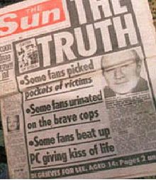 Quattro giorni dopo l’incidente, il 19 aprile del 1989, il Sun uscì nelle edicole con in prima pagina un titolo a caratteri cubitali, citando alcune testimonianze di un anonimo agente di polizia e di un membro del partito conservatore, che accusavano i tifosi del Liverpool di aver ostacolato i soccorsi, di aver attaccato la polizia e i soccorritori e addirittura di aver infierito sulle vittime: