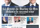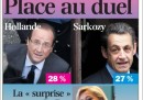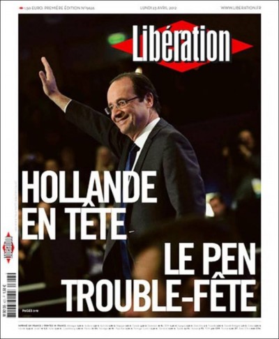 Le prime pagine dei quotidiani francesi di oggi sono occupate naturalmente dai risultati delle elezioni presidenziali con la possibilità che la Francia torni ad avere un presidente socialista dopo 17 anni: Hollande in testa su Sarkozy, il “duello atteso” per il ballottaggio fra i due, e il risultato a sorpresa di Marine Le Pen, “guastafeste” (con rima) per Libération, che supera anche il risultato di suo padre nel 2002. Non c’è la prima pagina di Le Monde, che esce dopo l’una.