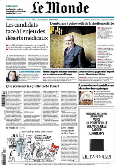 I quotidiani francesi si avvicinano al ballottaggio in cui sarà scelto il presidente della Repubblica – mancano nove giorni – concentrati sul ruolo della destra nell’appoggio a Sarkozy. Il quale, assieme a molti suoi alleati, sta superando ogni imbarazzo nei confronti delle relazioni con la suddetta destra che ha votato Marine Le Pen. Libération sottolinea le simpatie dell’Europa per Hollande, gli altri giornali privilegiano questioni che riguardano le insufficienze della Sanità, gli annunci di Sarkozy sulla sicurezza, la scuola. E diversi riprendono il “duello a distanza” delle due interviste ai candidati andate in onda ieri sera in tv.