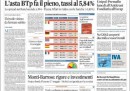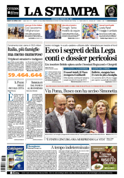 I giornali di oggi hanno notizie diverse in apertura, quasi sempre legate a dati economici: il Corriere della Sera, il Mattino, l’Unità e il Secolo XIX si occupano dell’aumento da maggio delle tariffe della luce, Repubblica calcola il costo per le famiglie delle tasse locali, mentre Libero titola con la cifra di duemila miliardi di euro, che rappresenta il record raggiunto dal debito pubblico italiano. La Stampa apre con l’indagine sui conti della Lega, con l’ipotesi di riciclaggio di soldi della ‘ndrangheta, il Manifesto commenta i dati del censimento e l’aumento delle persone che vivono in baracche o roulotte, il Giornale titola sulla “stanchezza di Monti”, ipotizzando elezioni anticipate in autunno, e il Messaggero ha in apertura la sentenza di appello per il delitto di via Poma con l’assoluzione di Raniero Busco.