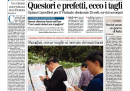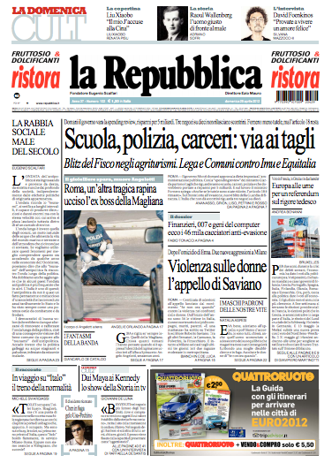 Oggi i principali quotidiani italiani aprono con l’ipotesi di nuovi tagli alla spesa pubblica da parte del governo che stavolta dovrebbero interessare scuola, polizia e carceri per evitare un aumento dell’IVA. Intanto c’è grande attenzione anche sui prossimi controlli fiscali che interesseranno gli agriturismi per il primo maggio e si baseranno sull’accesso facilitato alle banche dati immobiliari per il recupero, come scrive il Corriere della Sera, di 10 miliardi di evasione fiscale. Il Giornale e Libero puntano invece, come accade da un po’ di tempo, sul disagio degli imprenditori italiani, mentre il Secolo XIX parla di “muro dei sindaci” contro la nuova tassa sugli immobili, l’IMU. I giornali sportivi parlano della lotta scudetto tra Juve e Milan e della contestazione di ieri dei tifosi della Roma, che hanno chiamato sotto la curva il capitano Francesco Totti a fine partita per dirgli di convincere l’allenatore Luis Enrique a lasciare la squadra.