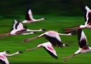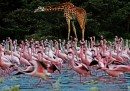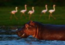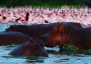 Fenicotteri, ippopotami e giraffe lungo il lago Oloidien, vicino a Naivasha, in Kenya. Nella zona vivono milioni di fenicotteri, spostandosi in cerca di zone dal clima più secco – e quindi coi laghi più ricchi di fitoplancton.