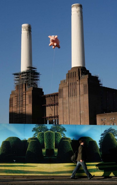 Nelle tecnologie e nella produzione energetica, le cose cambiavano già rapidamente nel Ventesimo Secolo, e i costi di funzionamento della centrale di Battersea divennero presto eccessivi. Già nel 1975 fu chiusa una delle due sezioni, e nel 1983 l’altra. Un movimento di affezionati alla sua architettura si creò subito e Battersea fu dichiarata sotto tutela storica. Nel frattempo era successa una piccola cosa che aveva moltiplicato in tutto il mondo la notorietà della centrale, fino ad allora cara solo ai londinesi. Era successa una piccola cosa quadrata, di circa trenta centimetri di lato. La copertina del disco dei Pink Floyd del 1977, “Animals”, illustrata da una fotografia della centrale in tutto il suo tetro splendore. Da allora, i fans che arrivano a Londra con il treno da Gatwick hanno un improvviso sussulto quando se la vedono passare davanti ai finestrini lungo il viaggio. Lo scatto di quella foto, poi, è una storia nella storia di Battersea. Il grande maiale gonfiabile che sulla copertina di “Animals” fluttua tra le ciminiere, si liberò dal cavo che lo tratteneva a terra e attraversò la rotta di un aereo in atterraggio. L’aeroporto di Heathrow sospese i decolli e un elicottero inseguì vanamente il maiale, che alla fine atterrò nelle campagne del Kent.