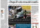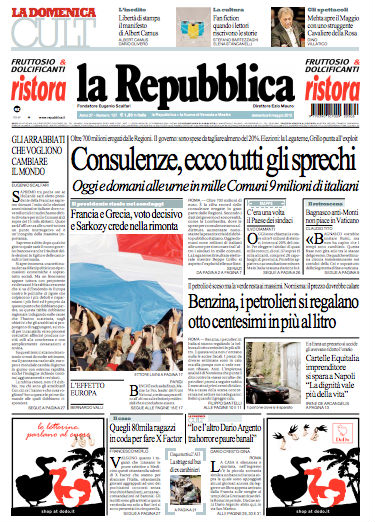 Oggi i tre principali quotidiani italiani aprono con tre notizie diverse: Repubblica con gli sprechi delle consulenze pagate con i soldi dei contribuenti dalle pubbliche amministrazioni (Stato, regioni, comuni e province), il Corriere della Sera con “il buco nero” nei conti delle regioni italiane, mentre la Stampa con la “sfida” del leader dell’UdC Pierferdinando Casini a PD e PdL sul sostegno al governo Monti. Tutti, ovviamente, parlano anche delle elezioni amministrative che si terranno oggi e domani in Italia, ma anche delle altre importanti elezioni che si terranno in Europa, e cioè in Francia, Grecia, Serbia e Germania (anche qui si tratta di elezioni locali). Viene dato molto spazio anche all’incidente del pullman di ieri vicino Padova, nel quale sono morte almeno 5 persone e alle partite di calcio di questa sera, ossia Inter-Milan e Cagliari-Juventus, che decideranno molto probabilmente il campionato di serie A di quest’anno (il “grande triangolo”, lo chiama la Gazzetta dello Sport).