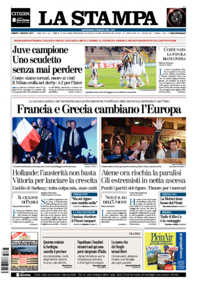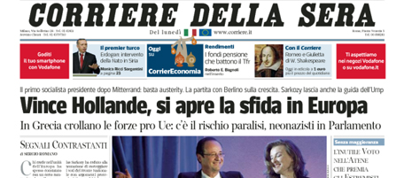 La notizia di apertura su tutti i giornali di oggi è l’elezione di François Hollande a Presidente della Repubblica in Francia, con le possibili conseguenze sulle politiche dell’Unione Europea alla quale il neo presidente chiede interventi che rilancino la crescita economica. Anche i risultati delle elezioni in Grecia, con la vittoria di estremisti di destra e sinistra e il crollo dei “partiti del rigore” che rendono difficile la formazione di un nuovo governo, prendono molto spazio sulle prime pagine, come la conquista dello scudetto da parte della Juventus, alla quale sono dedicati naturalmente i titoli dei quotidiani sportivi di oggi.