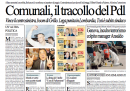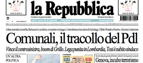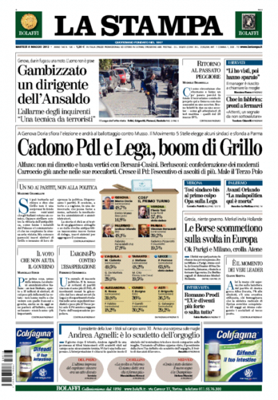 Su tutti i giornali di oggi l’apertura è dedicata ai risultati delle elezioni amministrative, e quasi tutti titolano sul crollo di PDL e Lega e il successo di Grillo e del suo movimento. Per l’Unità il PD rimane “solo fra le macerie” dei vecchi partiti, il Giornale sottolinea la “sberla” per il PDL, punito per il sostegno al “governo delle tasse”, il Manifesto unisce i risultati delle elezioni in Italia, Francia e Grecia per evidenziare la sconfitta dei partiti del rigore economico, e la Padania punta sul successo di Tosi a Verona. Su tutte le prime pagine troviamo anche la notizia del ferimento a Genova dell’amministratore di Ansaldo Nucleare, con l'”allarme terrorismo” lanciato dagli inquirenti.
