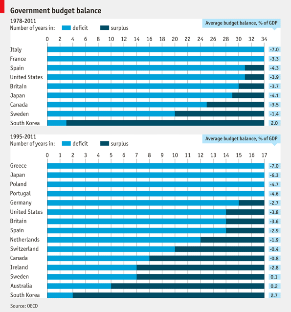 L’Economist ha pubblicato due grafici sui bilanci degli ultimi anni dei paesi più ricchi. Come scrive nel breve articolo allegato, per quanto l’austerità possa non piacere, non esiste un’alternativa bella e pronta a portata di mano. Finanziare la crescita vuol dire spendere e, a guardare i bilanci degli stati, anche quella è una scelta piuttosto azzardata. Negli ultimi trenta anni i bilanci dei paesi più ricchi sono stati molto spesso in disavanzo, anche se diversi paesi sono riusciti a invertire la tendenza negli ultimi tempi, come la Germania ma anche altri in difficoltà come la Spagna e l’Irlanda. Insomma, sia in tempi di crisi che in tempi di prosperità, i governi trovano sempre qualche ragione per spendere più soldi di quanti entrano nelle casse dello stato. L’Italia è prima nella classifica dal 1978 al 2001 per disavanzo, seguita dalla Francia, e lo stesso si può dire di altri paesi in grossa crisi come Grecia e Portogallo dal 1995 al 2011.