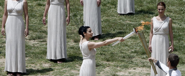 Oggi si è tenuta nell’area archeologica di Olimpia, in Grecia, la cerimonia di accensione della torcia olimpica. La fiamma è stata accesa alle 12 ora locale (le 11 in Italia) in una cerimonia a cui hanno partecipato undici attrici vestite da sacerdotesse, ricollegandosi idealmente con le cerimonie che si svolgevano nei Giochi olimpici antichi, che si svolgevano proprio ad Olimpia. Il rito vuole che la fiamma venga accesa dalla luce del sole: per far questo si utilizza uno specchio concavo. La fiamma accesa a Olimpia verrà portata con una staffetta, usando una torcia, e verrà usata per accendere il braciere o tripode olimpico a Londra il 27 luglio, giorno di apertura della manifestazione. Il braciere rimarrà sempre acceso per tutta la durata delle gare e verrà spento il giorno di chiusura dei giochi.