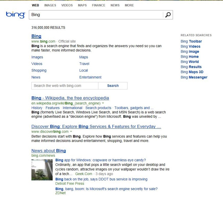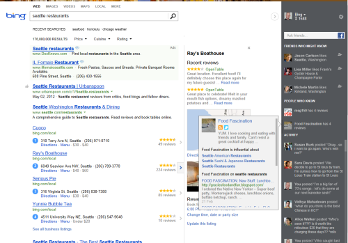 Microsoft ha deciso di riorganizzare radicalmente le pagine dei risultati di Bing, realizzando tre distinte colonne che danno informazioni e dati di vario tipo legati alle ricerche effettuate. La colonna di sinistra dà i risultati tradizionali, quella centrale indicazioni e suggerimenti, mentre la nuova colonna a destra è dedicata all’area social del motore di ricerca, in collaborazione con Facebook.