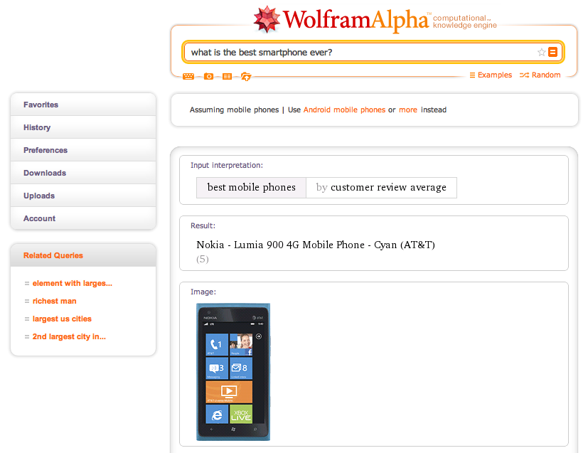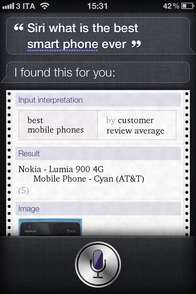 La particolare risposta è dovuta al fatto che per questo genere di cose Siri fa affidamento su WolframAlpha, il “motore computazionale di conoscenza” che interpreta le parole inserite nelle ricerche, proponendo direttamente una risposta e non una serie di link verso siti che parlano della cosa richiesta. Il sistema ha stabilito, attraverso una media delle recensioni pubblicate online, che il Lumia 900 4G è al momento il miglior smartphone di sempre e per questo la risposta compare anche sugli iPhone, attraverso Siri.