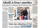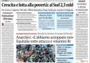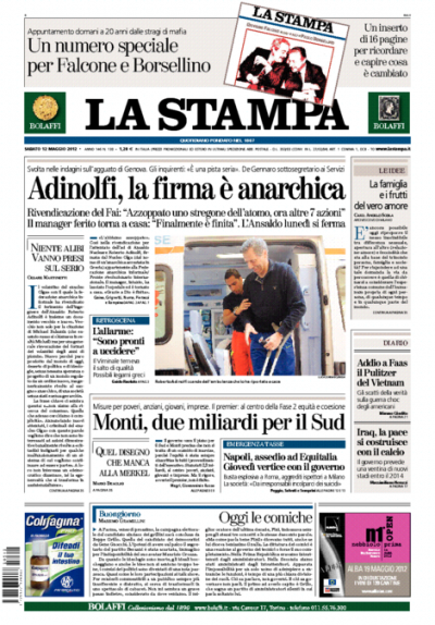 La rivendicazione anarchica del ferimento dell’amministratore di Ansaldo Nucleare Roberto Adinolfi e la minaccia di ulteriori azioni è in apertura oggi su la Stampa, il Giornale e il Secolo XIX. Repubblica, il Corriere della Sera e l’Unità titolano invece sul piano del governo per il sud, per cui verranno stanziati 2,3 miliardi di euro, mentre Libero, Europa, il Fatto e il Mattino si occupano delle proteste contro Equitalia, con gli scontri di ieri davanti alla sede di Napoli. Il Manifesto reagisce invece con un grande NO rosso alla decisione dei liquidatori che gestiscono il giornale di cessare l’attività editoriale.