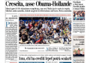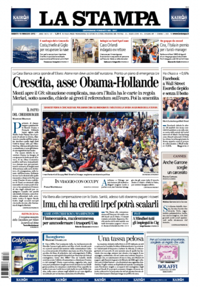 L’incontro del G8 a Washington è la notizia di apertura su quasi tutti i giornali di oggi, che sottolineano l’intesa fra Obama e Hollande per concentrare gli sforzi sulla crescita economica e la proposta della Merkel di un referendum in Grecia sull’uscita dall’euro, smentita dopo le polemiche suscitate. Fanno eccezione l’Unità, che si occupa delle proteste dei sindaci per l’IMU e della cassa integrazione per tutti i dipendenti della FIAT di Mirafiori, il Giornale, che apre con la notizia della conferma della Cassazione per il proscioglimento di Berlusconi nell’inchiesta Mediatrade, e Libero e il Fatto, che titolano sull’indagine per il rapimento di Emanuela Orlandi, per il quale è stato indagato per concorso in sequestro di persona l’ex parroco della basilica di Sant’Apollinare, dove era seppellito De Pedis.