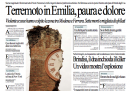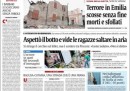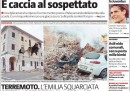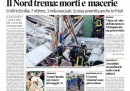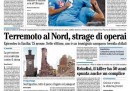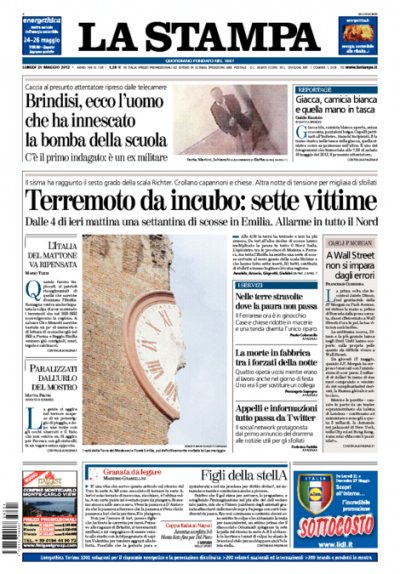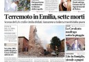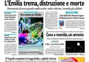 L’apertura dei giornali di oggi è dedicata al terremoto di ieri notte in Emilia che ha provocato sette morti, con l’eccezione del Giornale che invece titola sull’immagine dell’attentatore di Brindisi, ripresa da una telecamera di sorveglianza. I quotidiani sportivi aprono con la vittoria della Coppa Italia da parte del Napoli e con la promozione in serie A di Torino e Pescara.