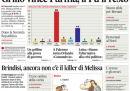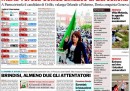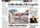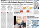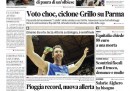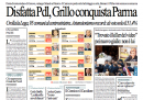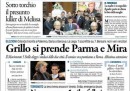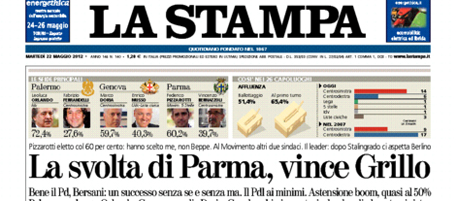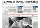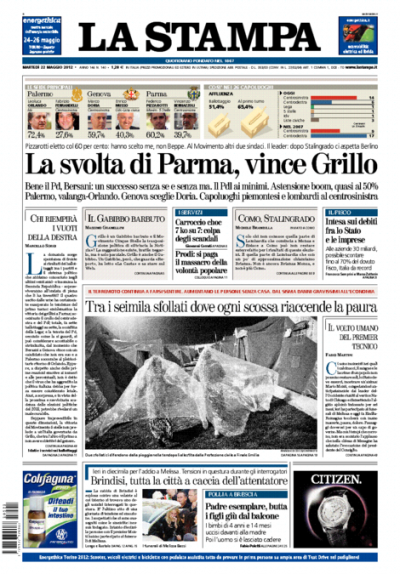 I risultati dei ballottaggi per le elezioni amministrative sono la notizia di apertura sui giornali di oggi: tutti evidenziano il successo del Movimento 5 stelle, con la vittoria del suo candidato a Parma, mentre Repubblica si concentra sulla “disfatta” del PDL, il Corriere della Sera titola “più città a sinistra”, il Mattino sottolinea le divisioni fra il neo sindaco di Parma e Beppe Grillo e il Giornale dà del “comico” a Bersani per aver esultato per i risultati elettorali. Le altre notizie presenti su tutte le prime pagine sono il terremoto in Emilia, con il numero degli sfollati che sale rispetto alle prime valutazioni, e le indagini sull’attentato di Brindisi, dove non è ancora stato identificato l’attentatore ripreso in un video di sorveglianza.