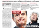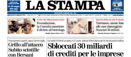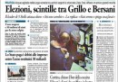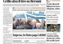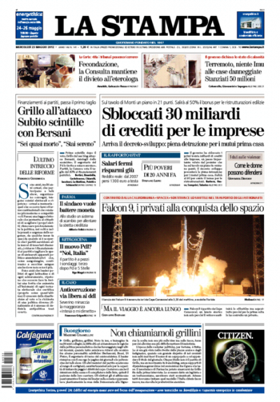 I giornali di oggi hanno in apertura notizie diverse: la crisi del PDL per Repubblica e Libero, che invita i vertici del partito a dimettersi, la polemica fra Beppe Grillo e Bersani, definito “quasi morto” dal leader del Movimento 5 Stelle, sul Corriere della Sera, Europa e l’Unità. La Stampa, il Messaggero, il Secolo XIX e il Mattino aprono invece con la decisione del governo di sbloccare 30 miliardi di crediti che le imprese hanno con lo Stato, mentre il Giornale sottolinea i fischi a Monti nell’incontro con gli abitanti delle zone terremotate in Emilia e il Manifesto si occupa della reazione degli studenti della scuola di Brindisi all’attentato di sabato scorso.