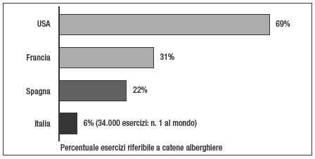 Non siamo riusciti a sviluppare, soprattutto al Centro-Sud (inclusa la capitale) quel turismo «premium» che pretende strutture alberghiere di qualità e trasporti eccellenti. L’Italia è il paese che ha il minor numero di esercizi alberghieri riferibili a catene alberghiere: il 6 per cento contro il 22 per cento della Spagna, il 31 per cento della Francia e il 69 per cento degli USA. Nel paese del turismo non è nata una sola catena internazionale, mentre la Spagna ha NH Hoteles, la Francia Accor e gli USA Starwood. Questa frammentazione non ha penalizzato solo il turismo nelle località balneari, ma anche quello di cultura nelle città d’arte: il turismo a Roma, Firenze e Venezia è sottosviluppato e i visitatori delle città italiane fanno soggiorni più brevi e spendono meno di quelli che visitano le altre capitali del turismo all’estero: Parigi, ad esempio, registra 75 milioni di presenze all’anno contro i 25 di Roma. Anche i dati relativi alle località sciistiche sono indicativi: l’Italia ha il 22 per cento delle piste sciabili di tutte le Alpi, ma solo il 12 per cento di quota di mercato, il 50 per cento di piste in più della Svizzera, ma la metà dei visitatori. Solo il 15 per cento delle presenze nelle Alpi italiane è costituito da stranieri, contro il doppio nelle Alpi francesi e il 37 per cento in Svizzera, Austria e Germania.