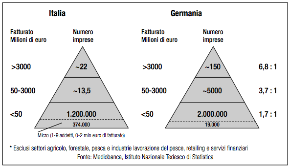 E soprattutto, per fatturati più alti, il rapporto tra le aziende tedesche e quelle italiane è molto peggiore di quello tra i relativi PIL: 5000 aziende tedesche con un fatturato tra i 50 milioni e i 3 miliardi di euro contro 1350 in Italia, e 150 aziende tedesche con un fatturato superiore ai 3 miliardi contro 22 italiane.