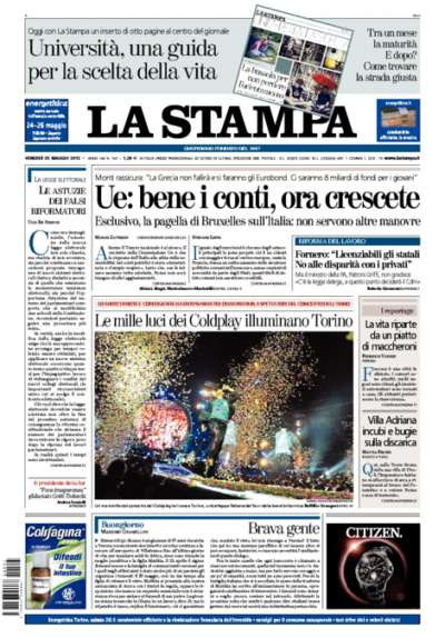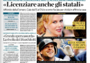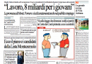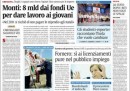 La maggior parte dei giornali di oggi apre con le dichiarazioni di Monti, che nell’incontro con il Forum dei giovani ha promesso un piano da 8 miliardi per l’occupazione giovanile. La Stampa titola invece con l’approvazione dell’Unione Europea per i conti dell’Italia, e l’invito a stimolare adesso la crescita, mentre il Secolo XIX, il Manifesto e l’Unità sottolineano le parole del ministro Fornero, che vuole estendere la possibilità di licenziamento anche ai dipendenti pubblici. Il Giornale apre con le dichiarazioni dell’ex tesoriere della Margherita Lusi sui pagamenti effettuati a dirigenti del partito, mentre Libero si occupa del primo discorso del neo presidente di Confindustria Squinzi.