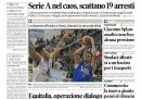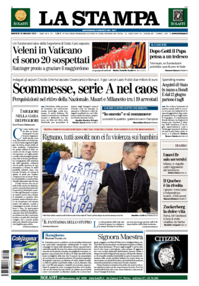 La notizia di apertura sui giornali di oggi è l’inchiesta sulle scommesse nel calcio, che ha visto ieri l’arresto di 19 persone fra calciatori e organizzatori delle combine e il coinvolgimento dei due giocatori della nazionale Criscito e Bonucci e dell’allenatore della Juventus Conte. Altre notizie che si trovano su quasi tutte le prime pagine sono l’assoluzione degli imputati nel processo per gli abusi sui bambini nell’asilo di Rignano Flaminio, e gli sviluppi dell’inchiesta in Vaticano sulla diffusione di documenti riservati che ha portato all’arresto del maggiordomo del Papa.