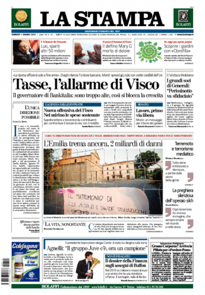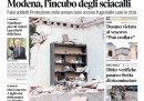 Il terremoto in Emilia è ancora in apertura su molti giornali di oggi, con il Mattino e il Messaggero che sottolineano l'”allarme sciacalli” e il Corriere della Sera che titola sulle scosse che continuano a colpire la regione. La Stampa e Repubblica aprono invece sulle parole del Governatore della Banca d’Italia Visco che chiede un taglio delle tasse e della spesa per rilanciare la crescita, mentre Libero, il Tempo e i quotidiani sportivi si occupano dell’informativa della Guardia di Finanza sul portiere della Juventus Buffon che avrebbe scommesso 1,5 milioni di euro sul calcio.