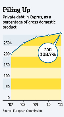 Secondo il governo, l’economia cipriota crescerà nel 2012 solo dello 0,8 per cento, ma l’FMI è ben più pessimista, e cioè che si contrarrà dell’1,2 per cento. Il debito privato, come si vede dalla tabella di fianco, è in forte crescita. I tassi di interesse dei titoli di stato sono saliti notevolmente negli ultimi tempi (quelli dei bond a 10 anni sono addirittura al 14 per cento) e le banche stanno già cedendo: recentemente il Parlamento ha approvato il salvataggio proprio della Banca Popolare di Cipro, che nella ristrutturazione del debito greco ha perso circa 2 miliardi di euro. Questo bailout costerà al paese circa il 10 per cento del suo PIL.