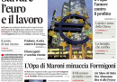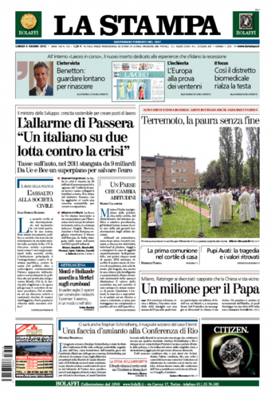 Per la maggior parte dei giornali di oggi la notizia di apertura è il piano di Unione Europea e Banca Centrale Europea per fare fronte alla crisi dell’euro, mentre la Stampa e il Messaggero si occupano del decreto per lo sviluppo che sarà approvato dal governo mercoledì. Il Corriere della Sera titola invece sulla nuova forte scossa di terremoto che ha colpito l’Emilia ieri sera, e il Giornale segue i movimenti all’interno del Partito Democratico.