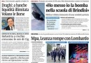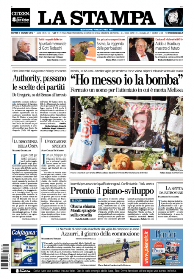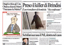 L’apertura di quasi tutti i giornali di oggi è sulla notizia del fermo di un uomo che avrebbe confessato di aver messo la bomba che ha ucciso una studentessa davanti alla scuola di Brindisi. Il Giornale titola invece sulla proposta di riforma presidenzialista presentata dal segretario del PDL Alfano, il Manifesto si occupa dell’elezione dei nuovi membri delle Authority per le comunicazioni e per la privacy, il cui metodo sarebbe un ulteriore favore al partito di Grillo, l’Unità apre con l'”alleanza occulta” fra PDL e Lega che avrebbe salvato Formigoni dalla sfiducia e il senatore De Gregorio dall’arresto.