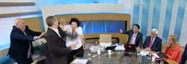 Nel corso di un dibattito televisivo ha tirato un bicchiere d'acqua contro una deputata di sinistra e colpito al volto un'altra ospite