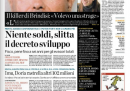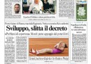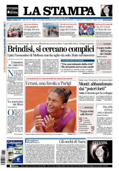 Le notizie principali sui giornali di oggi sono due: il Corriere della Sera, il Giornale, l’Unità, il Manifesto e Libero aprono con il rinvio del decreto sviluppo per la mancanza di copertura economica e con le parole del Presidente del Consiglio Monti che si sente abbandonato dai “poteri forti”, mentre la Stampa, il Messaggero, il Mattino e il Secolo XIX si occupano degli sviluppi delle indagini sull’attentato di Brindisi e dei dubbi degli inquirenti sul movente del killer. Repubblica segue invece le nomine RAI, per cui oggi dovrebbe essere la giornata della decisione, e i quotidiani sportivi dedicano l’apertura alla vittoria di Sara Errani che raggiunge la finale del Roland Garros e all’inizio dei campionati europei di calcio.