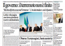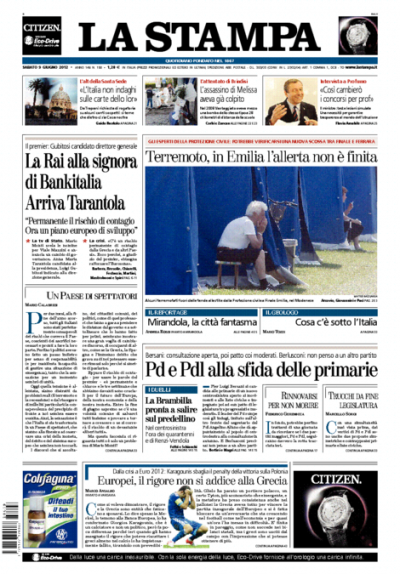 Le notizie di apertura sui giornali di oggi sono diverse: la Stampa, il Corriere della Sera, Repubblica e il Tempo aprono con l’allarme lanciato dal governo sul terremoto dopo la relazione della commissione grandi rischi che mette in guardia sulla possibilità di nuove scosse in Emilia, il Messaggero, il Fatto, il Secolo XIX e il Mattino puntano sulle nomine dei nuovi presidente e direttore generale della RAI, il Giornale, Libero, il Manifesto e Europa si occupano invece degli scenari elettorali dopo la decisione di PD e PDL di fare le primarie per scegliere il prossimo candidato premier. L’Unità titola sul richiamo di Obama all’Europa per misure più decise per il rilancio dell’economia, mentre il Sole 24 Ore apre con la richiesta della Spagna di accedere agli aiuti europei per aiutare le banche in difficoltà.