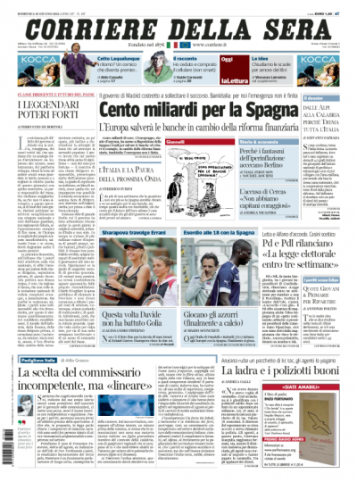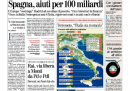 Gran parte dei quotidiani oggi in edicola apre con il prestito internazionale di circa 100 miliardi accordato (c’è chi dice imposto) dall’Europa per salvare le banche spagnole dal fallimento. I giornali di destra, invece, puntano su altri argomenti: il Giornale sulla “stangata dell’estate”, ossia “L’IMU uccide le imprese”, mentre Libero con “Bersani sposa i gay”, in riferimento alle parole di ieri del segretario nazionale del Partito Democratico in favore di maggiori diritti per le coppie gay. L’Unità apre invece con un’intervista al leader di Sinistra e Libertà, Nichi Vendola, che annuncia la sua candidatura alle primarie del centrosinistra per le prossime elezioni politiche, insieme a quella del sindaco di Firenze Matteo Renzi. E poi, oggi è il grande giorno dell’Italia, che fa il suo esordio ai campionati europei di calcio in Polonia e Ucraina contro i campioni del mondo della Spagna.