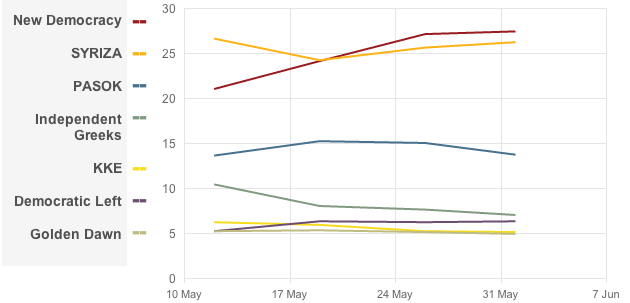 La BBC ha fatto una media dei risultati degli ultimi sondaggi dei vari istituti, giorno per giorno. Le rilevazioni si fermano al 1 giugno perché, secondo la legge greca, non possono essere diffusi sondaggi nei 14 giorni precedenti al voto.