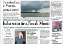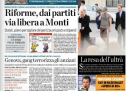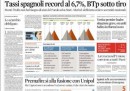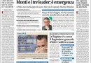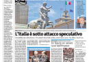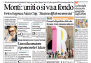 L’apertura dei giornali di oggi è dedicata alla situazione sui mercati finanziari, con l’Italia nel mirino della speculazione: Repubblica, il Messaggero e il Mattino si occupano del vertice fra Monti e i segretari dei partiti che sostengono il suo governo in cui il Presidente del Consiglio ha chiesto una maggiore coesione intorno alla sua azione, il Corriere della Sera e la Stampa sottolineano le parole di Monti per il quale l’Italia non ha bisogno di aiuti da parte dell’Europa, mentre il Giornale e il Manifesto si preoccupano del destino della moneta unica europea.