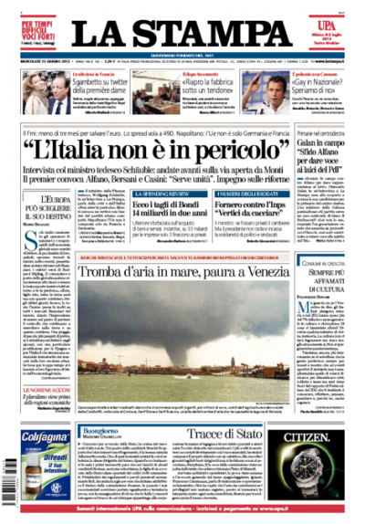 L’apertura dei giornali di oggi è dedicata alla situazione sui mercati finanziari, con l’Italia nel mirino della speculazione: Repubblica, il Messaggero e il Mattino si occupano del vertice fra Monti e i segretari dei partiti che sostengono il suo governo in cui il Presidente del Consiglio ha chiesto una maggiore coesione intorno alla sua azione, il Corriere della Sera e la Stampa sottolineano le parole di Monti per il quale l’Italia non ha bisogno di aiuti da parte dell’Europa, mentre il Giornale e il Manifesto si preoccupano del destino della moneta unica europea.