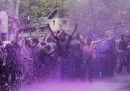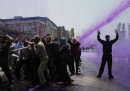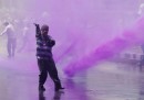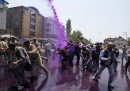 La polizia ha spruzzato acqua colorata contro i manifestanti che chiedono, tra le altre cose, l'aumento dell'età pensionabile