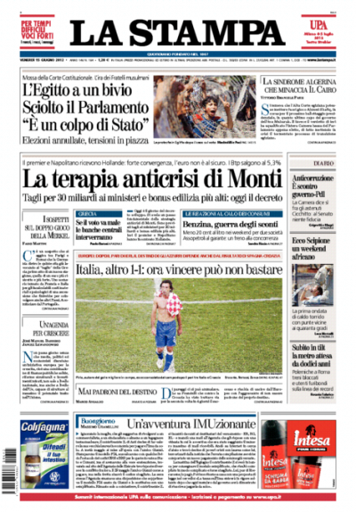 L’incontro di ieri fra il Presidente del Consiglio Monti e il Presidente francese Hollande è la notizia in apertura su molti giornali di oggi, mentre la Stampa si occupa delle tensioni in Egitto dopo l’annullamento delle elezioni e lo scioglimento del Parlamento, il Corriere della Sera apre con un’intervista al capo della Bundesbank, il Giornale propone i risultati di un suo sondaggio che vede gli italiani favorevoli al ritorno della lira e l’Unità commenta l’approvazione da parte della Camera della legge anticorruzione. I quotidiani sportivi aprono con il pareggio dell’Italia agli europei e con il timore di un accordo fra Spagna e Croazia nella prossima partita ai danni dell’Italia.