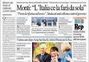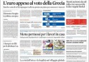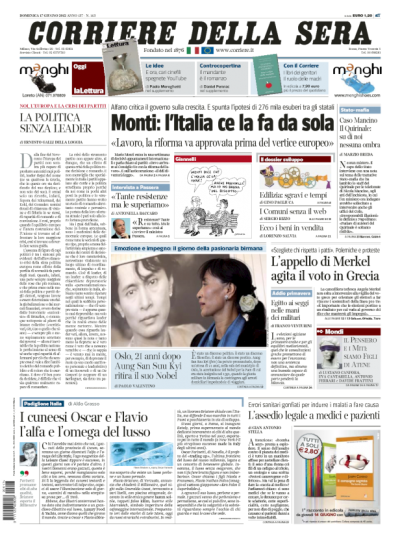 I tre principali quotidiani italiani, Corriere della Sera, la Repubblica e la Stampa, aprono con l’intervento di ieri a Bologna del premier italiano Mario Monti al festival de La Repubblica delle Idee. Il Corriere e la Repubblica hanno addirittura lo stesso titolo: “Monti: ‘L’Italia ce la farà da sola’”. I quotidiani riservano grande spazio anche al discorso di ieri della leader dell’opposizione birmana Aung San Suu Kyi a Oslo per la cerimonia del premio Nobel per la Pace che le è stato assegnato nel 1991. Oggi, inoltre, si vota per le elezioni legislative in Grecia (è la seconda volta in poco più di un mese) e per il ballottaggio delle presidenziali in Egitto, oltre che per il secondo turno delle legislative in Francia. Infine, c’è anche il caso della “trattativa Stato-Mafia” per cui ieri il presidente Napolitano è intervenuto con un comunicato piuttosto netto definendo “illazioni” le ultime ricostruzioni sulle telefonate dell’ex ministro degli Interni Nicola Mancino al Quirinale nelle quali quest’ultimo si sarebbe lamentato delle indagini su di lui.