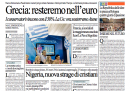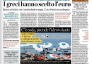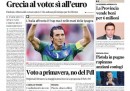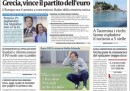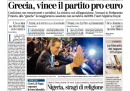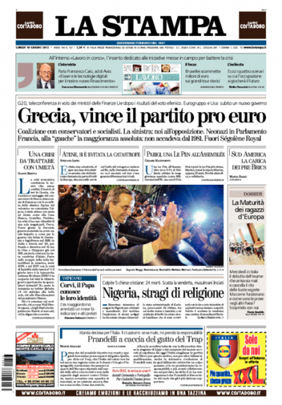 I risultati elettorali in Grecia, con la vittoria dei conservatori filo europei di Nuova Democrazia, sono in apertura su tutti i giornali di oggi. Le altre notizie in prima pagina sono la strage di cristiani in Nigeria, il secondo turno delle elezioni in Francia, con la maggioranza assoluta in Parlamento ai socialisti, e i tempi per il voto sulla riforma del lavoro in Italia, mentre i quotidiani sportivi presentano la partita di stasera dell’Italia agli europei, sempre con un occhio al “biscotto”.