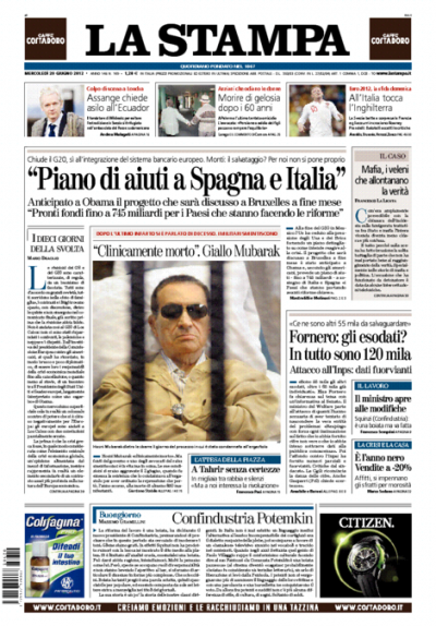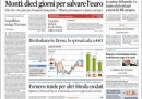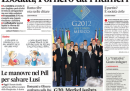 L’apertura dei giornali di oggi è dedicata a notizie diverse: la Stampa, il Corriere della Sera, il Messaggero e il Secolo XIX seguono la chiusura del G20, con le anticipazioni su un piano europeo che prevede di usare il fondo salva Stati per arginare la speculazione sui mercati, il Manifesto, il Giornale, Libero e il Secolo d’Italia aprono sulle parole del presidente di Confindustria Squinzi, che ha definito “una boiata” la riforma del lavoro, l’Unità e il Mattino si occupano dei nuovi numeri forniti dal ministro Fornero sugli esodati, mentre la Repubblica titola sulla crisi del mercato immobiliare in Italia.