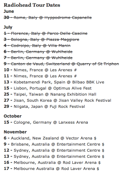 Dopo il crollo del tetto del palco prima del concerto di Toronto, in cui è morto un membro dello staff tecnico, i Radiohead hanno deciso di rimandare alcune date dei concerti previsti in Europa. Tra queste ci sono anche quelle italiane: Roma 30 giugno, Firenze 1 luglio, Bologna 3 luglio e Codroipo, in Friuli, 6 luglio. Sul loro sito e su Facebook, i Radiohead hanno spiegato le ragioni della loro decisione spiegando anche che le nuove date saranno comunicate il 27 giugno: