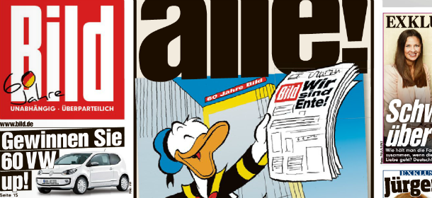 Oggi la Bild, il tabloid tedesco più venduto in Germania e nel mondo, festeggia i 60 anni dalla sua prima pubblicazione con un numero speciale dal titolo “Bild per tutti”, con Paperino in versione strillone. Come annuncia oggi l’editoriale del direttore della Bild, Kai Diekmann, per festeggiare l’evento sono state distribuite 41 milioni di copie gratuite, mentre sul sito del tabloid si può scaricare senza costi la versione online. In realtà, il primo giorno effettivo di pubblicazione della Bild fu il 24 giugno del 1952, ma la Bild festeggia oggi perché domani non esce in edicola, rimpiazzata, come ogni settimana, dalla sua versione domenicale, chi si chiama Bild am Sonntag (“Sonntag” significa appunto domenica).
